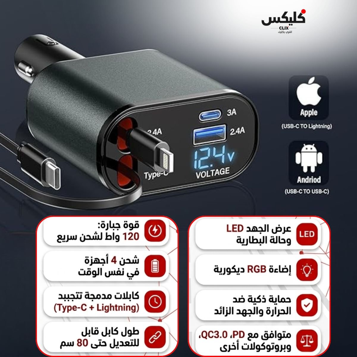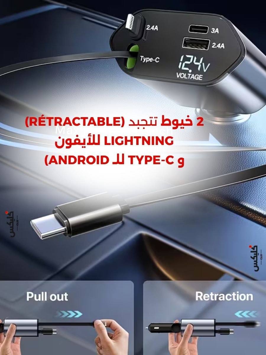 🔄 خيوط تتجبد (Rétractable): فيه زوز خيوط (Lightning للأيفون و Type-C للـ Android) يوصل طولهم لـ 80 سم، تجبدهم كيف تستحقهم ويرجعوا لبلاصتهم بـ "كليك" وحدة.. وداعا للتشربيك!